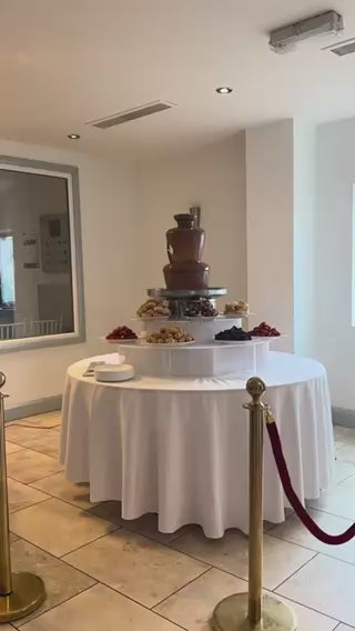 A chocolate fountain is a decorative and functional device used to serve melted chocolate in a visually appealing and interactive way, often seen at parties, weddings, and dessert buffets.